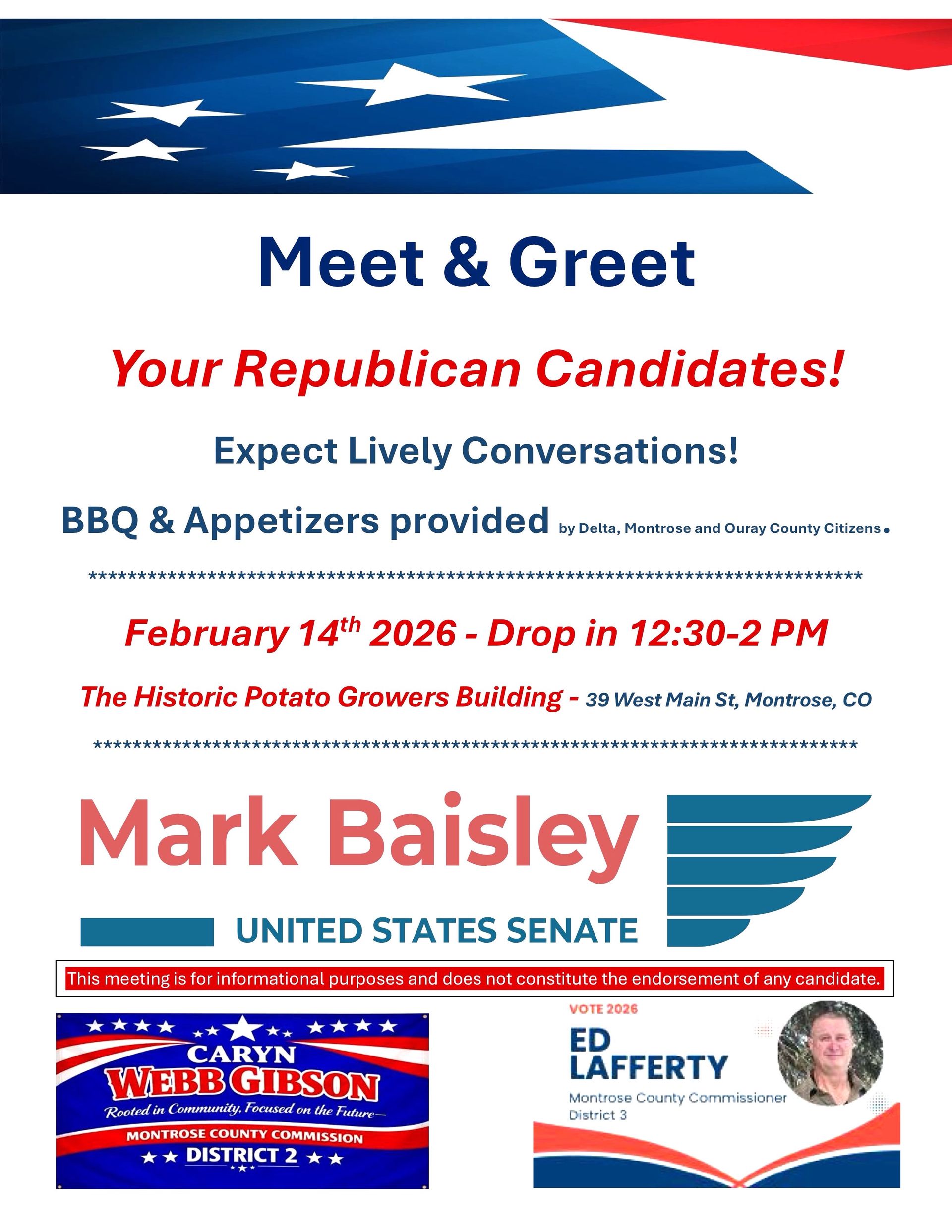 Disclaimer: The Montrose County Republican Central Committee does not endorse or fund Primary candidates or events. Candidate events are shared for informational purposes only.